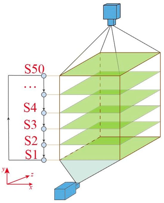 The slope was loaded with lateral displacement, with a maximum load displacement of 40 mm. Before the experiment, the side plate was removed and the loading plate was adjusted to make contact with the soil. Then, the power of the laser was adjusted to ensure that the reflected spot brightness of the soil particles was appropriate. The camera was positioned above the model box with its lens aligned perpendicularly to the laser plane. The focal length and aperture were adjusted to capture a clear laser spot image. The loading distance was 1 mm each time, and the servo motor was loaded at a constant speed of 0.5 mm/s. At the end of loading, the two measurement subsystems move synchronously to scan and photograph the soil at a speed of 0.2 mm/s. The synchronized motion trajectory of the camera and laser is shown in Figure 4. Starting from the sliding surface, the scan passed sequentially through points S1, S2, S3, up to S50, with each laser slice spaced 2 mm apart. Each measurement section was held for 1 s, during which the high-speed industrial camera automatically captured images to produce laser scatter images for each section. The experiment involved repeatedly executing the steps mentioned above until a load displacement of 40 mm was achieved, at which point the trial concluded upon complete destruction of the pile or soil.