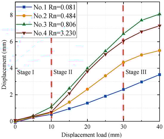 The pile surface roughness influenced pile–soil interaction mechanisms by altering the MPs’ load sharing ratio. The load displacement curves exhibit three deformation stages (Figure 5 and Figure 12). The displacement cloud imagery of the soil at each loading phase is depicted in Figure 6. Aside from experiment No. 1, where the pile surface exhibited specific roughness, the surrounding soil demonstrated a comparable deformation pattern. Sufficient friction between the pile and soil is crucial for developing supporting arch footings. Based on the soil arch model, soil arches are divided into end bearing and friction arches. Pile roughness enhances arch formation, greatly influencing friction arches across all experimental groups.