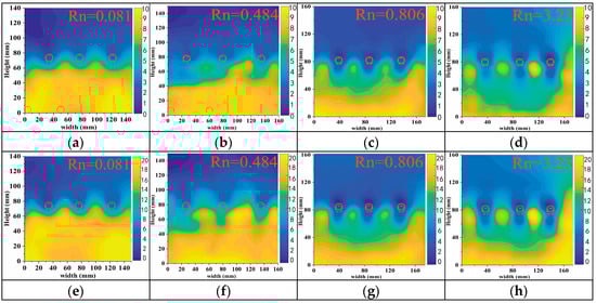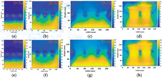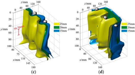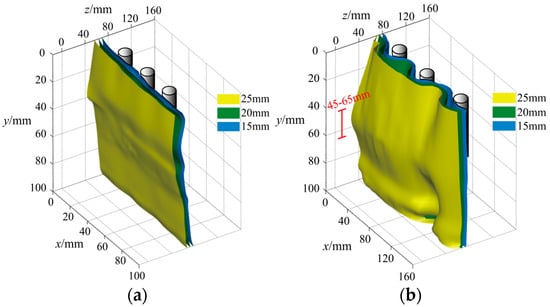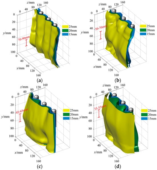 When the surface roughness of the pile differs greatly at the same pile spacing, the soil behind the piles deformed in a more similar manner (Figure 10). In the vertical direction, the soil arch was thin at the top of the pile. At roughness Rn = 0.081, contour surfaces were closely spaced, causing soil near the pile top to slide out, with the maximum arch position around 80–90 mm. As roughness increased, the soil arch moved upward and thickened. The maximum soil arch positions of experiments No. 2–No. 4 were between 50–70 mm, 45–60 mm, and 30–60 mm, respectively.