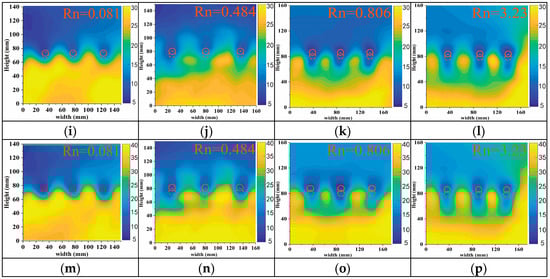 Displacement cloud images of the soil with different pile roughness ((a–d): loading displacement was 10 mm, (e–h): loading displacement was 20 mm, (i–l): loading displacement was 30 mm, (m–p): loading displacement was 40 mm).