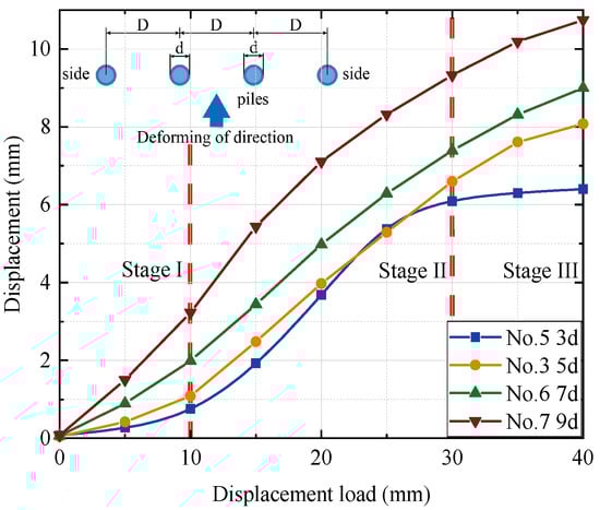 The load displacement curves of MP tops at different pile spacings are illustrated in Figure 7. Generally, pile top displacement decreased as spacing increased. Final displacements were 6.40 mm, 8.07 mm, 8.99 mm, and 10.75 mm in the four experiments.