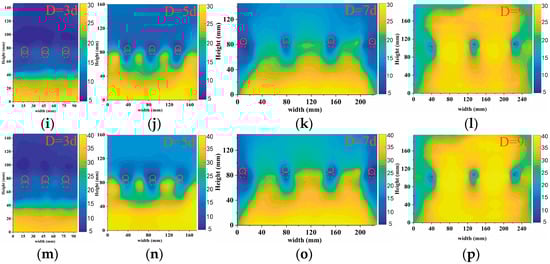 Effect of pile spacing on soil arch ((a–d): loading displacement was 10 mm, (e–h): loading displacement was 20 mm, (i–l): loading displacement was 30 mm, (m–p): loading displacement was 40 mm).