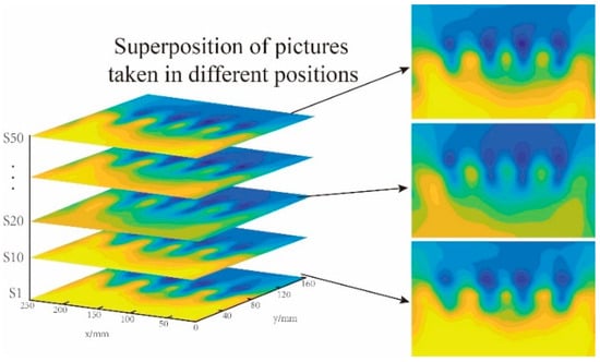 Three-dimensional reconstruction refers to the construction of a three-dimensional visual image model using a series of scattered images on the plane []. Most of the soils and structures in geotechnical engineering will involve three-dimensional deformation. Using 3D reconstruction technology, the deformation in space can be analyzed more intuitively. The displacement clouds of each soil layer obtained by automatic scanning is shown in Figure 9. As can be seen in Figure 9, the first slice was at the sliding surface, and the remaining slices extend upward along the vertical with fixed spacing.