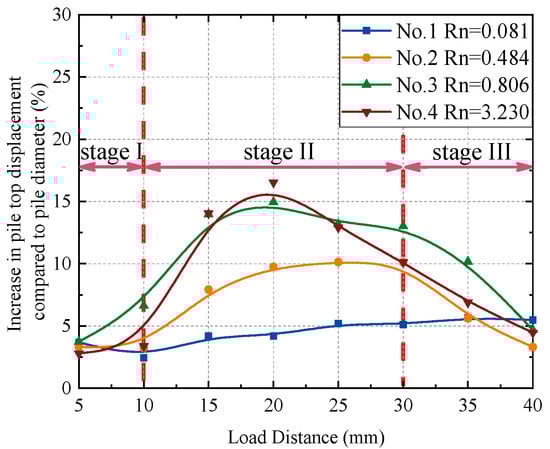 Experiments No. 2, No. 3, and No. 4 on pile top load displacement showed similar trends in three stages: slow, accelerated, and unstable deformation. In stage I, soil compression occurred behind the pile, with top displacement under 1.5 mm and no plastic deformation. Stage II saw accelerated deformation, uneven soil displacement, increased load sharing, and plastic deformation, with top displacements over 5.5% of pile length—Experiment No. 3 increased by 6.05 mm. In stage III, displacement grew slowly, with No. 2 increasing by 0.89 mm and No. 3 reaching 8 mm and it was considered that the pile had collapsed.