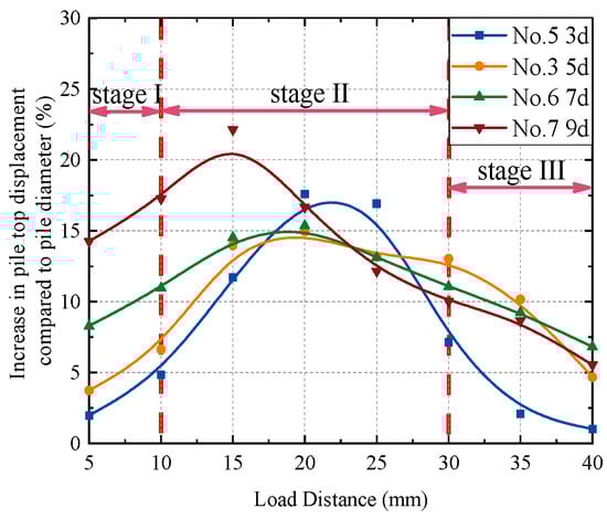 The pile spacing in experiment No. 7 was 9 d, the phase of the pile top load displacement curve was not obvious, and the changing trend was different from the other three groups. With a 10 mm load, the pile top displacement reached 3.22 mm, exceeding the other groups significantly. From 20 mm to 40 mm loading, the curve’s slope was 0.182, smaller than the others. This was due to the large pile spacing in Experiment No. 7, eliminating adjacent pile interactions.