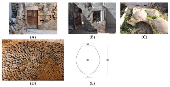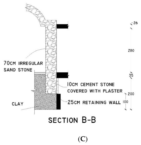 - Plastering Works: The old cement works and plants were removed, and traditional plastering from lime (hydrated lime) and sand was applied to the domes to fill the cracks between stones. Grouting from lime and sand was utilised on the exterior walls to maintain the stone appearance. The damaged section of the northern wall was reconstructed using traditional methods, incorporating imported sandstone from the West Bank, Palestine (Figure 8A). This approach ensured that the new structure closely matched the existing one, thereby enhancing its sustainability.