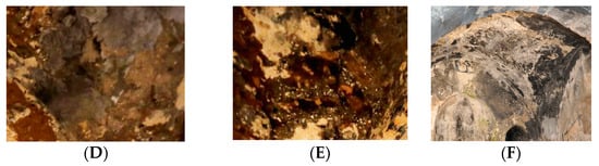 - Biological Colonisation: The presence of lichens, moss, and other biological organisms was noted on the shaded and moisture-retentive areas of the sandstone. This type of decay can lead to the biochemical deterioration of the stone surface (Figure 4E,F).