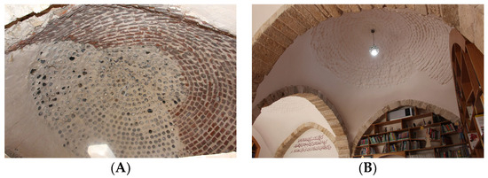 - Ceiling Work: In the three hemispherical domes, these potteries were filled with plaster and painted with lime to blend in seamlessly with the walls. The domes underwent structural consolidation in various areas with traditional plastering techniques employed to fill in the scaled and cracked sections, ensuring the integrity and continuity of the surface (Figure 9A,B).