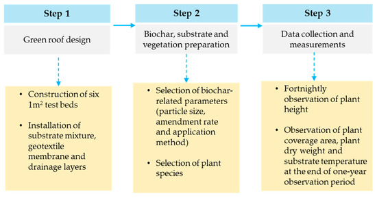 The methodological framework used in this study consists of three steps and is presented in Figure 1. The first step consists of the design and construction of the six GR test beds. Step 2 consists of the selection of biochar and biochar-related parameters. Based on a detailed literature review of biochar-GR research and the identified knowledge gap, it was decided to investigate the impacts of three biochar-related parameters, namely biochar amendment rate, particle size, and application methods. Within the second step, different plant species suitable for extensive GRs were considered, and 3 species were chosen to investigate the benefits of biochar amendment to plant performance. Step three consists of data collection and undertaking measurement of selected parameters. Further details regarding these three steps can be found in the following sub-sections within this section.