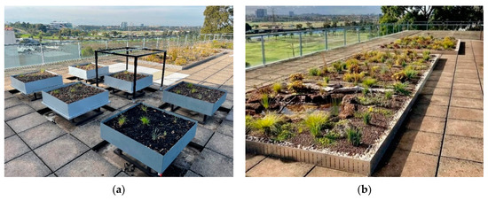 The observations were carried out on the rooftop of Building M at the Footscray Park campus of Victoria University (VU), Victoria, Australia. The study area is under the influence of the temperate oceanic climate (Köppen climate classification Cfb), which is characterized by warm summers and mild winters. In 2020, 50 m2 of GR was installed on the rooftop of Building M as part of a project generating green spaces for the campus area (Figure 2a). However, this 50 m2 GR was not suitable for the investigation of the benefits of biochar to plant growth, and hence, six 1 m2 GR test beds were installed on the same rooftop (Figure 2b). Six 1 m × 1 m galvanized steel trays elevated 0.3 m from the roof tiles followed a typical extensive GR design with a 150-mm substrate thickness, non-woven geotextile membrane as a filter layer, and a 50-cm drainage layer by Atlantis 20 mm Flo-cell and VersiDrain® 30. In terms of GR types, built-in-place GRs, and modular GRs are two commonly used extensive GR systems [55]. Modular GR trays have advantages, including being lightweight, flexible and affordable design, easy installation and expansion, and low maintenance [56,57]. However, the experimental setup in this study aimed to utilize 1 m2 trays to mimic the conventional built-in-place extensive GRs that provide long-lasting durability and long-term benefits, especially in areas prone to extreme weather conditions.
