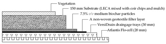 Figure 3 presents a cross-section of the GR system used in this study, featuring the application of 7.5% v/v medium biochar particles at the bottom of the substrate. The following sections provide details on the GR substrate mixture, biochar characteristics, experimental setup involving GR and biochar, and the selected plants used in this research.