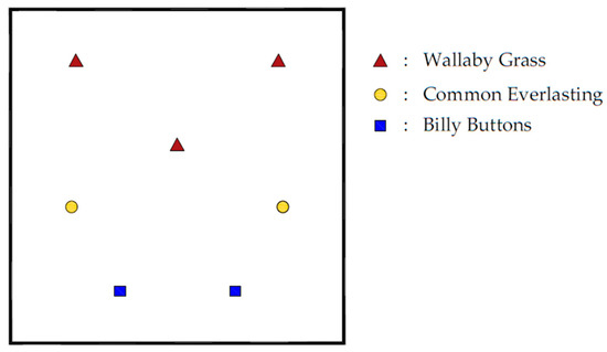 Pre-grown plants of three common wallaby grasses (Rytidosperma caespitosum), two common everlasting wildflowers (Chrysocephalum apiculatum), and two Billy Buttons wildflowers (Pycnosorus globosus) were transferred to each test bed on 5 May 2023. These plants are drought-tolerant and are well-suited for the thin, extensive GR substrate used in this study and can withstand infrequent irrigation, irregular maintenance, and low substrate nutrients. Moreover, since they are native plants, they are expected to adapt to the local climate and soil conditions more easily and provide broader coverage. The size of each plant species was similar at the time they were planted in the test beds. The distribution of the plants in each of the six test beds is shown in Figure 4. Subsequent to this, the observation period started. The chosen 150-mm GR substrate is a mixture of light-expanded clay aggregate (LECA), hardwood mulch, and coir chips (80%, 15%, and 5% v/v, respectively). LECA is commonly known as a lightweight material that can absorb 18% of water by weight. The same substrate was used for all GR test beds. However, the differences between the treatments were the application methods and particle sizes of biochar. Biochar applied in this study used woody materials (eucalyptus) as feedstock with the pyrolysis target temperature of 500–550 °C. The examined biochar particle size ranges were 1–3 mm and less than 1 mm (hereinafter referred to as medium and fine particles, respectively). Biochar was added in different ways, including thoroughly mixing the biochar into the substrate (mixing method), applying biochar to the top surface (top-dressed method), and applying biochar at the bottom of the substrate (bottom-applied method). Table 1 provides the specifications of the GR-biochar experimental setup used in this study.