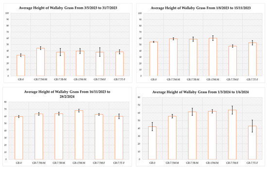 The first observation period recorded a maximum wallaby grass height of 52 cm in GR-7.5M-M. The positive impacts of biochar on the wallaby grass height could be seen even during the very beginning of the monitoring period. However, the differences between biochar and non-biochar GRs were insignificant (Figure 6). A similar trend was found for most test beds during the next observation period when this plant species grew taller and then dried out. The decrease in plant heights was observed at the end of the observation period. Biochar-related parameters generally did not have a significant impact, except in the case of GRs with fine biochar particles at the top of the substrate (GR-7.5T-F), which failed to increase the height of this plant species. In general, wallaby grass in biochar-amended GRs performed better than in traditional GRs in terms of plant height, and the most noticeable effects were recorded in the final observation.