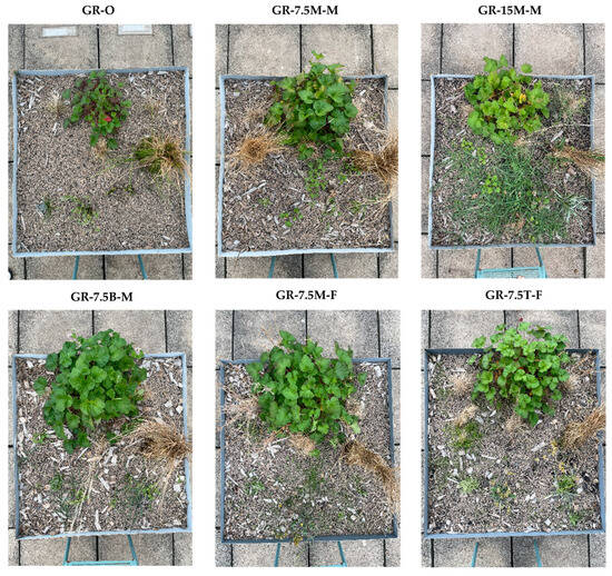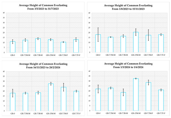 For the common everlasting wildflowers, all plants kept growing taller, even after the hot and dry period, and reached up to 33 cm in GR-15M-M. When compared to the control GR, the benefit of biochar in promoting the vertical development of common everlasting plants was not easily identifiable in some biochar test beds (Figure 7). The differences between those test beds were not significant, and no consistent trends were observed. The exceptions were GR-15M-M and GR 7.5M-F, which had the greatest impacts on biochar in the last two observation periods.