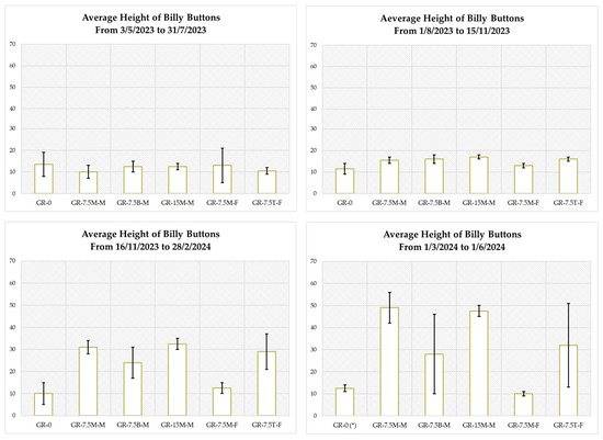 Figure 8 illustrates the growths of billy button plants, which in this study were notably weak in the first two observation periods. Furthermore, one of the billy button plants in the traditional GR test bed died during the last observation period, and the performance of billy button plants in the test bed with mixed fine biochar particles was remarkably poor. It could be due to the poor rooftop environmental conditions (drought stress, extreme winds, and so on). In contrast, they started developing quickly, with a maximum height of 56 cm in GR-7.5M-M observed during the last two observation periods. The differences between the test beds were negligible during the first and second observation periods. However, the positive impacts of biochar on the height of billy button plants became pronounced after the first two observation periods with the exception of GR-7.5M-F. Overall, medium biochar particles mixed at the application rates of 7.5% and 15% v/v had the highest performance.