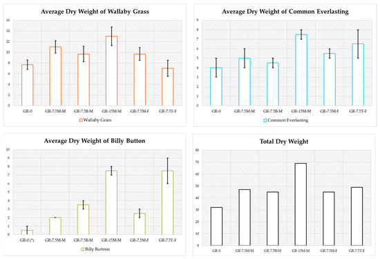 Since plant height cannot fully reveal the performance of the vegetation, another plant heath indicator, namely “dry weight” was taken into consideration. Plant dry weight was measured at the end of the study period, and the corresponding data are presented in Figure 9. The results demonstrate the variation of dry weights of studied plants according to plant species. Similar to height, the dry weight of wallaby grass in GR-7.5T-F was lower than that in GR-0. The impacts of biochar on other GR test beds were found to be positive, and the maximum dry weights of this plant species were from GR-15M-M. Moreover, the highest dry weights of common everlasting and billy button plants were also observed in GR-15M-M. Despite lower heights of the common everlasting plants in GR-7.5B-M and GR-7.5T-F than those in GR-0, dry weights from these two GRs with biochar were higher. A contrasting situation was observed in billy button plants in GR 7.5M-M, where plants were tall but had a low dry weight. In contrast to wallaby grass, the impacts of biochar on dry weights of both common everlasting and billy button plants were positive in all biochar-amended GRs. Taking the total dry weight into account, the test bed modified by mixing medium biochar particles at a dose of 15% v/v had the best performance. There were no significant differences between other biochar test beds.
