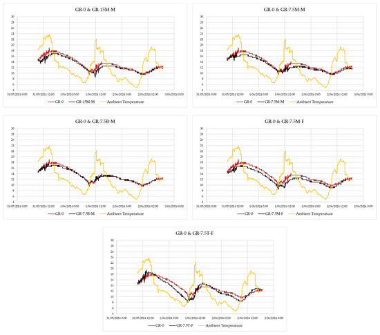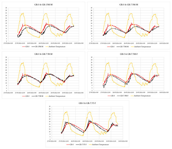 Figure 11 and Figure 12 illustrate temperature data at 5-min intervals collected from a thermal sensor installed at a 10 cm substrate depth in the center of each test bed Figure 11. demonstrates the substrate temperature in three consecutive hot days from 27 May to 29 May 2024, whereas data in Figure 12 was continuously recorded during three relatively cold days from 29 May to 2 June 2024. Regardless of the ambient rooftop temperature in hot and cold periods, a similar thermal pattern was identified in all test beds. Specifically, the temperature of biochar-amended substrates of GR-7.5M-M, GR-15M-M, and GR-7.5M-F was noticeably lower than that of GR-0 with no biochar. A slight improvement in substrate temperature was observed when biochar was applied at the bottom of the substrate of GR-7.5B-M. In contrast, biochar increased substrate temperature when it was applied using the top-dressed method (GR-7.5T-F) during the day. However, GR-7.5T-F released absorbed heat more quickly than GR-0 and cooled down faster at night. Although the substrate temperatures followed the same pattern during hot and cold days, the effects of biochar in reducing substrate temperature were more pronounced at higher ambient temperatures. Compared to GR-0, the maximum reduction in substrate temperature during the hottest times of the hot days was 4 °C and 3.5 °C for GR-7.5M-M and GR-15M-M, respectively. They were reduced to 2 °C during the cold days.