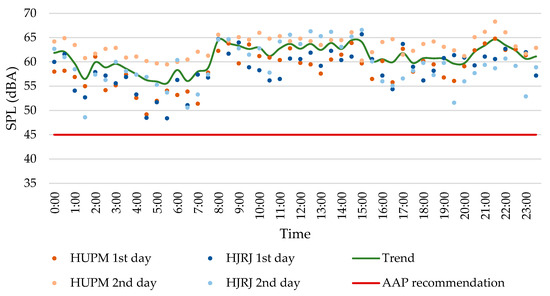 As a result of the acoustic measurements conducted in the NICUs of HUPM and HJRJ, significant differences in sound pressure levels between the two facilities were observed. On the first day of measurement at HUPM, an equivalent continuous sound level (LAeq) of 60 dBA was recorded over the 24 h period. On the second day, this value increased considerably to 63.8 dBA. In contrast, at HJRJ, the LAeq on the first day was 60.1 dBA and 60.9 dBA on the second day. This indicates greater variability in noise levels at HUPM compared to HJRJ.