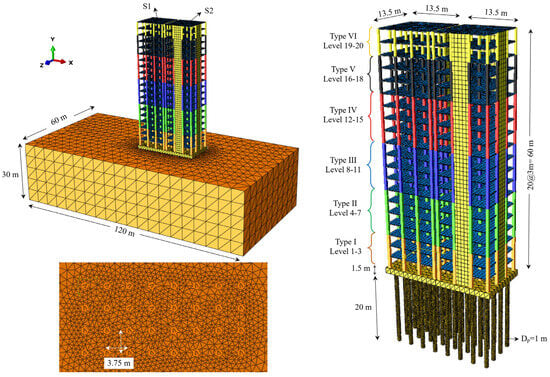 Two configurations comprising benchmark structures and soils have been simulated using ABAQUS [] to investigate the varying responses associated with the two structural schemes. This investigation utilizes two distinct 20-story RC building models, designated S1 and S2, to evaluate the impact of structural configuration on seismic response. Structure S1 represents a conventional bare-frame RC building. In this configuration, non-structural infill walls, such as brick or concrete panels, are absent between the RC columns and beams. Structure S2 employs the same fundamental RC structural system as S1. However, it incorporates additional RC shear walls strategically positioned around the building. These shear walls are interconnected via the floor slabs, creating a more robust lateral load-resisting system. In Section 3.1, the specifications of the structures are presented. Section 3.2 provides information related to the simulation of soil and its behavioral model. Section 3.3 presents information regarding the type of elements and meshing. Section 3.4 provides details including boundary conditions, loading types, and element interaction.