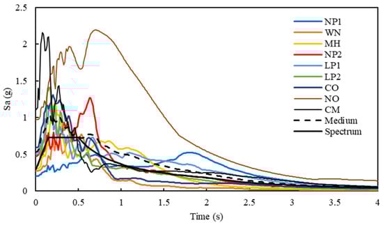 The seismic hazard was simulated using nine earthquake motions from the NGA database [] (Figure 2). The ground motions used for the analysis were chosen to comply with the life-safety limit state as defined by the relevant building code. These motions were specifically selected to represent a seismic event with a return period of 475 years. The ground motions are divided into three groups based on how strong it is. These categories are delineated as follows: low, denoting PGA values ranging from 0.1 g to 0.3 g; moderate, spanning PGA values between 0.4 g and 0.6 g; and high, encapsulating PGA values falling within the range of 0.7 g to 0.9 g. Table 2 details the properties of the chosen ground motions.