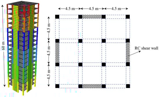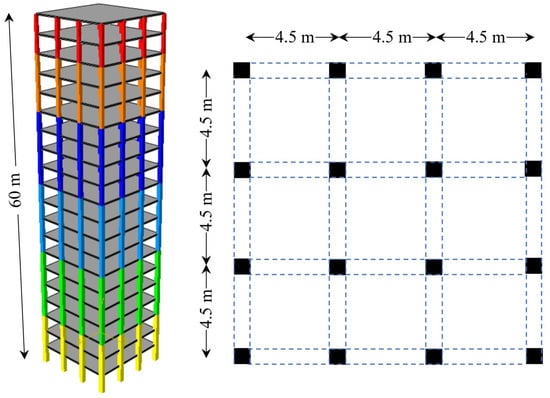 In this investigation, a moment-resisting concrete building measuring 13.5 m wide and 60 m high (equivalent to 20 stories) was studied. The building rested on a piled raft foundation system. The superstructure was configured with a symmetrical plan, divided into three equal spans of 4.5 m in both the longitudinal and transverse directions. Design and analysis of the structural components were conducted according to AS3600 [], using SAP2000 v14 [] software. The concrete members were assumed to have a compressive strength (f’c) of 32 MPa and a mass density of 2400 kg/m3. The modulus of elasticity of concrete was estimated at 30.1 GPa. The dimensions and arrangement of columns and floors are detailed in Table 4 and depicted in Figure 3.
