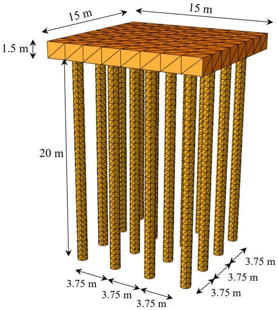 The foundation system comprises a 1.5 m thick raft footing measuring 15 m × 15 m in width, supported by 16 RC piles. Each pile is 20 m long and has a diameter of 1 m. The concrete and steel used in the foundation system possess the same mechanical properties as the other concrete components of the main structure. Each concrete pile is reinforced with 40 longitudinal rebars, each with a diameter of 25 mm. Additionally, the raft foundation is reinforced with two layers of rebar mesh, spaced 200 mm apart, with a diameter of 20 mm. The geometry and arrangement of the piles and foundation are shown in Figure 5.