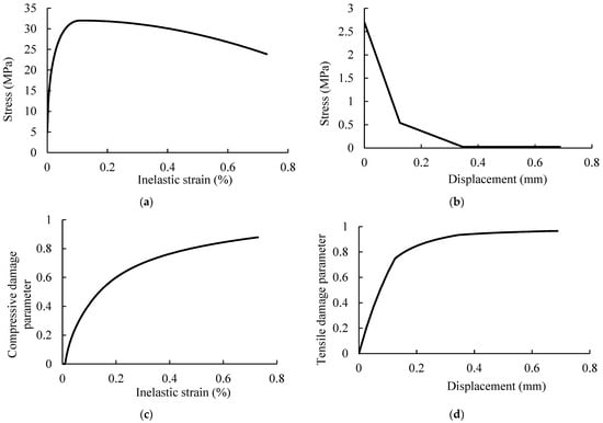 Concrete properties in the CDP model. (a) Compressive stress-inelastic strain curve. (b) Tensile stress-displacement curve. (c) Compressive damage parameter-inelastic strain curve. (d) Tensile damage parameter-displacement curve.