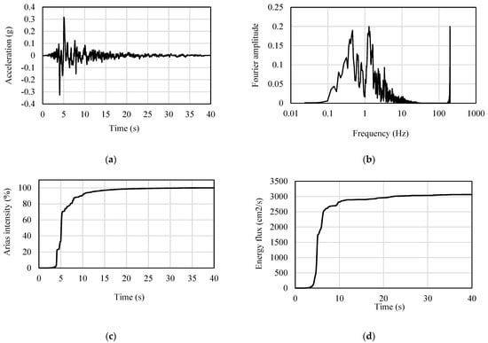Details of the El-Centro earthquake. (a) Time history acceleration. (b) Fourier amplitude spectrum. (c) Arias intensity. (d) Energy flux.