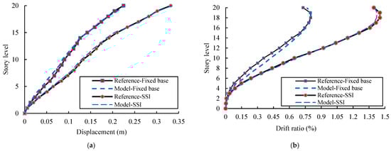 Comparison of lateral displacement of structures between numerical and reference models []. (a) Displacement distribution of story levels. (b) Drift ratio of stories.