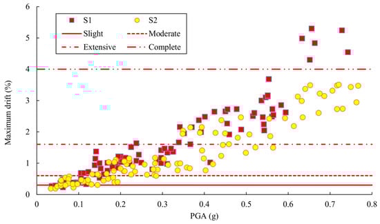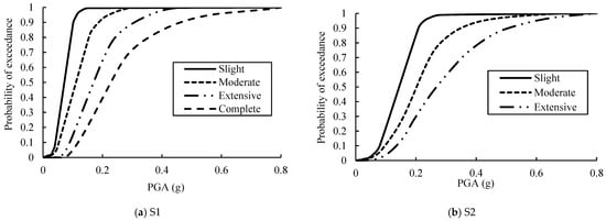 (b) Fragility curves assessed the seismic vulnerability of structures S1 and S2. They considered PGA and four damage levels. Structure S2 with shear walls showed a significant improvement in damage resistance compared to S1. This is quantified by a 38–56% increase in PGA required to reach each damage state in S2;