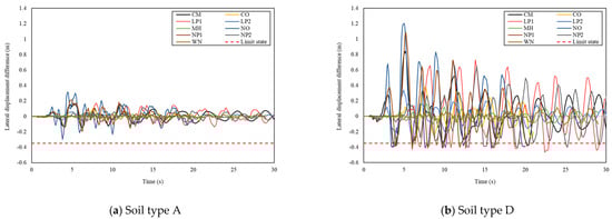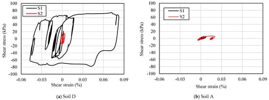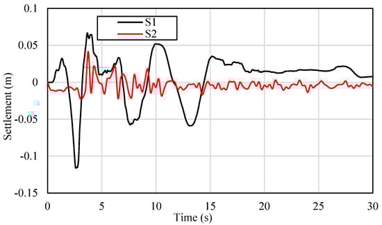 In this section, the response of the soil under the foundation is investigated. Figure 11 shows the behavior of two types of hard (Soil A) and soft soil (Soil D) under the most severe earthquake (Cape Mendocino-CM) in the form of a shear stress–shear strain curve. Based on Figure 11a, it can be seen that the soil under structure S1 deforms more than the soil under structure S2. This is due to the difference in the ductility of the structures. Figure 11 depicts the shear stress–strain response of soil type A for the two structures (S1 and S2). It can be seen from this result that the level of soil deformation is much smaller than that of soil type D, which indicates the importance of soil ductility and its importance in amplifying the overall system response. Comparing Figure 11a,b, it can be observed that the hysteresis loops are smaller when the structures are founded on stiffer soil than when they are founded on softer soil. Additionally, the difference between the curves is much smaller in the case of stiff soil than in the case of soft soil. This indicates the importance of structural ductility. Figure 12 shows the time history of the vertical displacement (settlement) of two structures founded on soil type D under earthquake CM. The settlement curves were extracted from a point on the edge of the foundation. It can be seen from the comparison between the two extracted curves that the rotational component in structure S1 is larger and more pronounced than in structure S2.
