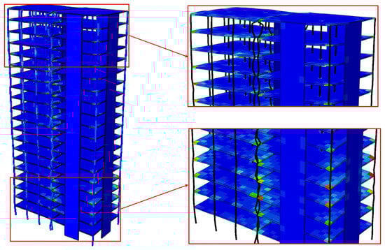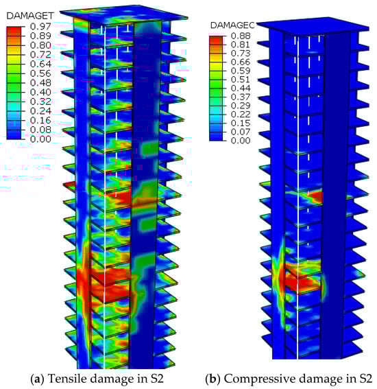 The time-dependent behavior of the horizontal displacement of the node at the corner of the plan at the highest level of both structures is shown in Figure 14. It can be observed from the responses that the difference in the response of the two structures becomes more pronounced when softer soil is used. This highlights the importance of incorporating the effect of SSI in the dynamic analysis of structures. It should be noted that the two structures collide when the difference in their lateral displacement at the roof level exceeds the predefined gap between them. Table 10 presents the values of the relative displacement difference in the roof level of the two structures subjected to various earthquakes and four soil types. Values exceeding 350 mm indicate the collision of the two structures, which are highlighted in red. Figure 15 shows the difference in the lateral displacement of the roof level of two structures resting on soil types A and D, plotted for 9 earthquakes. The limit state is shown as a dashed red line in Figure 15 as the pounding boundary of the two structures. It should be noted that the positive part of the curve represents the movement of the two structures away from each other, and the negative part of the curve depicts the movement of the two structures toward each other. Therefore, the limit state, shown by the dashed red line, is only shown in the negative part of the graph. Data presented in Table 10 and visualized in Figure 15 indicate that the free gap between the two structures (35 cm) cannot prevent the two structures from pounding under 6 earthquakes. Figure 16 shows the distribution of compressive damage and tensile damage in the RC slab and shear wall panels of the S2 structure under the earthquake NP1 (t = 2.78 s) and soil D. Based on Figure 16, it appears that some parts of the wall and roof have been damaged due to the collision of two structures with each other.
