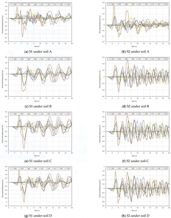 Horizontal displacement at the top level of structures S1 and S2 under different records and soil types.