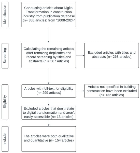 This study conducts a PRISMA assessment to evaluate a propre research methodology to ensure selecting relevant papers matching the research scope. The research method is divided into four phases: The first phase focuses on the identification that focuses on conducting an examination of papers from the publication database from 2008–2024. A total of 850 papers were identified in the first phase. The second phase is about screening articles that were applied to the related articles after reading titles, abstracts and the removal of redundancies. 567 articles were subsequently selected for further consideration. The third phase involves testing the eligibility of relevant articles after an analysis of the content of papers, and the number of articles reached 299, which is in deep focus on digital transformation in the construction phase. The final phase is related to the inclusion process, which entails a comprehensive quantitative and qualitative assessment of papers and thus brings the final number of papers equal to 154.