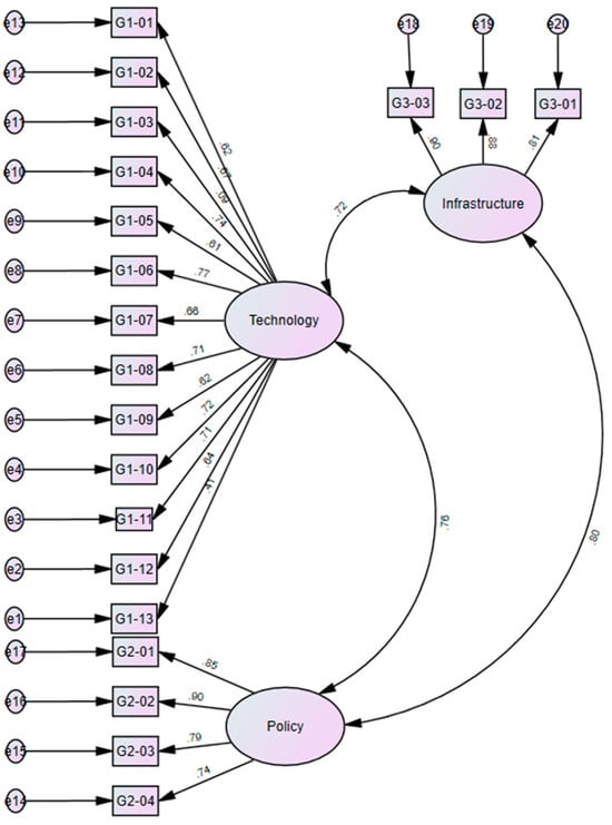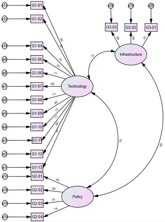 Convergent and discriminant validity are also assessed as part of the procedure for determining validity. The assessment of the questionnaire’s indicators’ reliability was conducted using the SPSS 29 statistics software package in conjunction with the Cronbach’s alpha test. This test ascertains the measurement’s coherence using a minimum threshold value of 0.7 []. The Standard Factor Loading (SFL) method was utilized to conduct a unidimensional assessment. As shown in Figure 4, the SFLs of all indicators exceeded the threshold of 0.40 defined in [] and had positive values. Therefore, the digital transformation readiness level index model successfully attained the criterion of unidimensionality. The results of this examination are illustrated in Table 3.