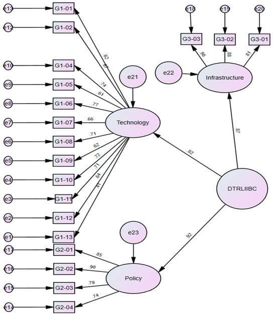 The creation of a structural model makes it possible to predict how primary and secondary components will correlate. For the structural framework of the DTRLIIBC in the execution phase, a reflective secondary construct is linked to three fundamental latent constructs, as shown in Figure 3: technology, policy, and infrastructure. The DTRLIIBC model indicates that there is a positive link between the DTRLIIBC and these three first-order constructs. The two main hypotheses were developed based on these presumptions and further divided into smaller hypotheses. The two main hypotheses guiding this investigation are as follows:
