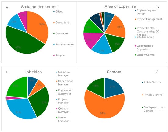 Obtaining sample data that accurately represent the complete population of interest to the researcher is the aim of this methodology. The authors of [] give a summary of the purposive sampling process, which consists of the following stages: the research problem and the specific information required are identified; participants or participant groups are selected; where appropriate participants or participant groups are identified based on the preset criteria; appropriate data collection techniques are implemented; and any potential biases or uncertainties are documented. This study’s participant groups were chosen based on their employment status as professionals in the digitalization sector of the construction industry. To lessen the impact of geographic bias, the survey was sent to a diverse set of specialists from different geographical areas.