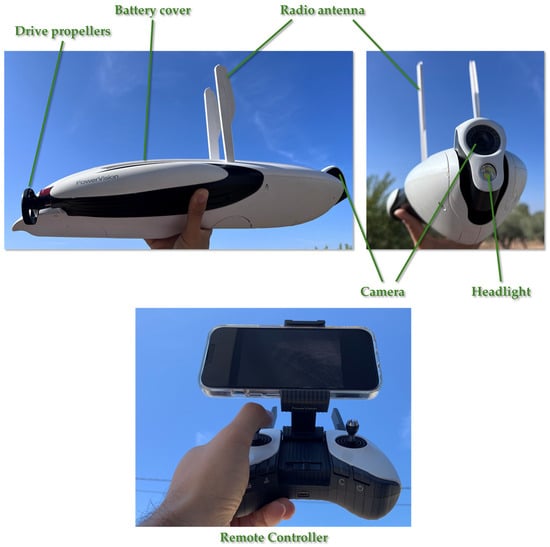 Figure 2). This drone has been manufactured in Beijing, China. It weighs 2268 g and is used in conjunction with a remote control linked to an iPad (iOS system) for better viewing. This underwater drone has a 4K HD camera with multiple resolution settings and the ability to rotate up to 220° on its own axis, allowing it to see above and below the water’s surface. It also has a built-in GPS with bathymetric detection and “return home” functions. It has a two-hour battery life and can reach a maximum speed of 4.50 m/s (16.20 km/h). This drone model was chosen for its simplicity in use and handling, as well as its accessibility. In addition, its low cost made it ideal for this initial research.