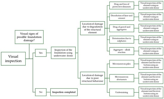 Figure 3, the inspection is concluded when the visual inspection does not detect any signs of damage to the foundation. However, when signs of damage to the foundation are discovered, the underwater drone is used to inspect the submerged elements.