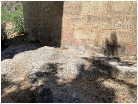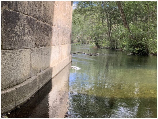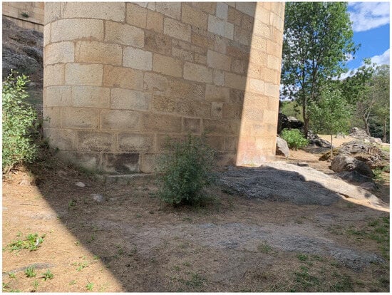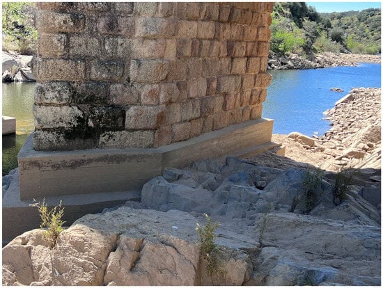 Figure 11). These are now outside the riverbed and, given the condition of the first ashlars, must have been submerged before the dam was built. It was also possible to verify that the piers and abutments of the bridge rest directly on outcropping substrates of thick two-mica granite, characteristic of this area of the Arribes del Duero [