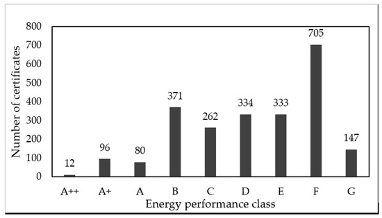 The data from the 2340 EPCs were then divided into nine sections and assigned to the classes of building energy efficiency, i.e., A++, A+, A, B, C, D, E, F, G.