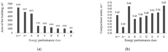 After collecting information about the geometric data of office buildings, the average heated area of certified buildings and the compactness ratio of each class were calculated. This analysis is important in determining the factors influencing the increase in energy efficiency of buildings. Figure 2a shows how the increase in energy efficiency class of buildings is followed by an increase in the heated area of office buildings. This means that office buildings with an increasingly large area were built, whose heat losses related to 1 m2 of heated area decreased even with the same thermal insulation of the external partitions. Therefore, the results suggest that increasing the size of buildings was an important factor in reducing their energy demand.