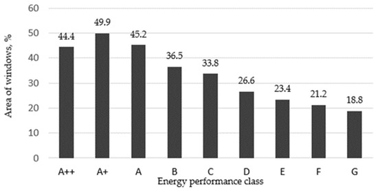 The number of transparent partitions in a building also has a significant influence on the energy efficiency of the building, so the average glazing area of each class of buildings was calculated. When designing office buildings, contradictions are also encountered here: the larger the glazing area, the greater the building’s heat loss (in cold climates, solar heat gains are unable to compensate for heat loss during the heating season). Lithuania’s geographical location also determines that a larger glazing area causes a greater energy demand for cooling during long summer days. Therefore, it would be logical, in order to achieve overall efficiency of the construction and use of office buildings, to minimize the area of transparent partitions, taking into account the requirements of natural lighting and environmental monitoring. However, designers of buildings followed a popular architectural trend, that a greater amount of glazing is one of the most visible indicators of a building’s prestige and value, so the area of glazing in buildings kept increasing. Figure 3 shows that the use of glazing in building envelopes has increased, including in class A+.