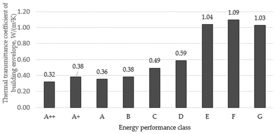 Thermal insulation of building external partitions in cold climate locations is considered as the main indicator affecting energy consumption for building heating. On the one hand, the use of thermal insulation and lower U-value windows in the building increases the price of the building; on the other hand, it reduces energy consumption and costs for thermal energy for a long period of the building’s operation. To achieve this balance, cost-optimal calculations are carried out on the basis of which the limits of optimal thermal insulation are determined, but due to constant changes in the prices of building materials, construction works and energy, individual insulation solutions within defined limits are adopted during the design of each building. The heating energy demand of the building also depends on the efficiency of the energy systems and the type of fuel they use [26]; therefore, an analysis of the dependence of average thermal insulation of external partitions on building energy efficiency class was carried out in order to demonstrate the changes in the insulation of buildings and their impact on the thermal energy demand of buildings. According to data extracted from EPCs and analysed (Figure 4), the thermal insulation of buildings has improved: the average thermal transmittance of the building envelope has decreased from 1.03 W/(m2·K) for class G to 0.32 W/(m2·K) for class A++.