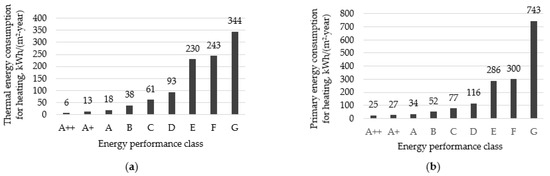 Average thermal (a) and primary (b) energy for heating, depending on building energy performance class.