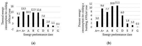 In order to achieve comparable results, the amount of the final energy for cooling for energy certification purposes is recalculated into the primary energy for cooling, considering that heat pump technology will be used for cooling, the efficiency of which depends on the class of the building. A positive trend can be seen in primary energy consumption for cooling of Class A++ buildings (Figure 6b), since the highest cooling efficiency of the heat pump was used in the calculation. The reduction of primary energy consumption for cooling to 3 kWh/(m2·year) is a good achievement, additionally considering the fact that only small investments are required because the same heat pumps are used for cooling the buildings as for heating.
