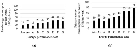Average thermal (a) and primary (b) energy for domestic hot water, depending on energy performance classes.