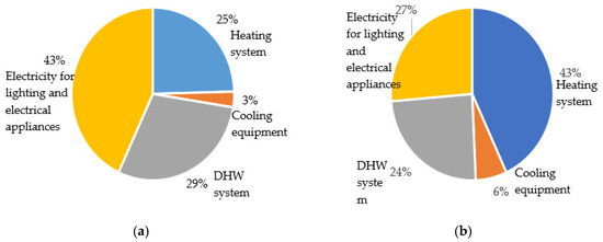 Share of primary energy consumption in buildings of A++ (a) and C (b) energy performance classes.