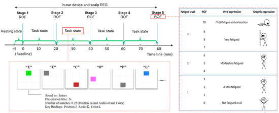 Before the cognitive task, participants were asked to sit quietly for 5 min to record baseline signals, serving as a reference point in subsequent data analysis. Then, different levels of mental fatigue can be induced by subjecting participants to an 80 min long cognitive task. In this study, we made the following assumptions to simplify the research. Participants’ self-assessment of mental fatigue levels exhibits similarities and lacks significant differences. This finding implies that regardless of whether the assessment is conducted before or after task execution, individuals’ subjective perception of their own mental fatigue levels remains consistent and does not show significant changes. In addition, the fatigue level evaluated by a modified Rating of Fatigue (ROF) scale [64] and the neurophysiological signal reflected by the scalp EEG were used as the ground truth of the real-time mental state (Figure 4). First, to monitor the participants’ subjective perception of their own fatigue levels, we conducted self-assessments every 20 min during the task by using a standardized scale called ROF (Rating of Fatigue). This allowed us to gather valuable information about how fatigued each participant felt at different time points throughout the experiment. In addition to self-assessment measures, we relied on objective indicators such as scalp EEG recordings and performance decrements in the cognitive task itself. Scalp EEG provides insights into brain activity patterns associated with different states of consciousness, including fatigue. By analyzing these neurophysiological signals in real-time via Bluetooth transmission, we were able to observe any changes or fluctuations indicative of increasing or decreasing levels of fatigue. For each participant, the scalp EEG indicator was determined by calculating the grand average of (theta + alpha)/beta for each 60-s data segment. To ensure the reliability of fatigue assessment, we evaluated the progression of mental fatigue by examining the correlation between this indicator and the results obtained from the ROF scale. Please refer to existing studies for the specific methods of judging the development trend of mental fatigue by the scalp EEG [5,35]. Finally, three 60 s raw data segments were chosen for each subject, reflecting distinct levels of mental fatigue: low, medium, and high levels of mental fatigue.