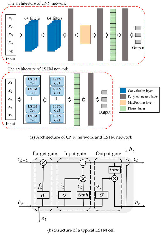 Following the preprocessing, feature selection, and dataset creation steps outlined in Section 3.3.1, a range of machine learning and deep learning classifiers were utilized to establish mental fatigue classification models, which were then used to investigate the feasibility of the proposed multimodal in-ear device for monitoring mental fatigue. Note that the classifiers selected in this study were chosen based on their established effectiveness in similar studies on fatigue classification, including six widely recognized models from the fields of machine learning and deep learning such as k-nearest neighbor (KNN) [71], support vector machine (SVM) [62], decision tree (DT) [61], random forest (RF) [71], convolutional neural network (CNN) [45] and LSTM network [46]. These models have demonstrated good classification performance in prior research [72,73]. The open-source Python-based machine learning library (scikit-learn), as well as the deep learning library (i.e., Keras), can easily implement efficient model training and assessment, enabling an evaluation of the practical feasibility of the developed multimodal in-ear device for monitoring workers’ mental fatigue in real-world applications. Note that for machine learning models, such as DT and RF, that contain many hyperparameters, we summarize the hyperparameters of the mentioned machine learning models in Table 6. Moreover, the hyperparameters of each machine learning model were optimized using a combination of grid search and K-fold cross-validation, as outlined in Table 7. A detailed description of the machine learning models used in this study, including their theoretical foundations, algorithmic structures, and typical applications, can be found in [74]. This reference encompasses pivotal models utilized in this study such as KNN, SVM, DT, and RF. In addition, CNN and LSTM networks are the deep learning models utilized in this study, with their network architectures illustrated in Figure 7a. These networks employ different approaches in processing data. The CNN network processes data through convolutional layers, fully connected layers, and maxpooling layers, whereas the LSTM network processes data through stacked LSTM cells. As shown in Figure 7b, a typical LSTM cell consists of a forget gate, an input gate, an output gate, and the cell state. The input gate it controls the update of new information to the current state ct, the forget gate ft determines which information from the previous cell state ct−1 should be discarded, and the output gate ot regulates the output ht of the LSTM cell. The update of the cell state in relation to the three gates can be described as follows: